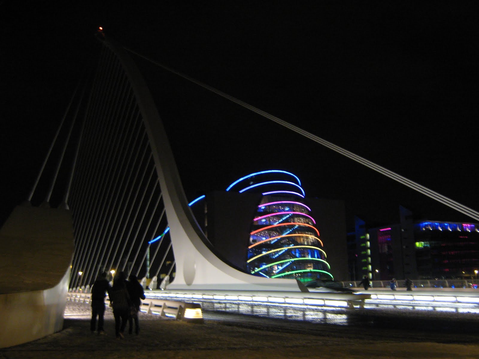 es on the main shopping street. We headed to the Maldron Hotel on Cardiff Lane just a bit removed from the City Center. It was half a block from the new Samuel Beckett Bridge which resembles a whale’s tail I suppose and was interestingly enough designed and built in the Netherlands and arrived by boat in Dublin in 2009. The bridge ap